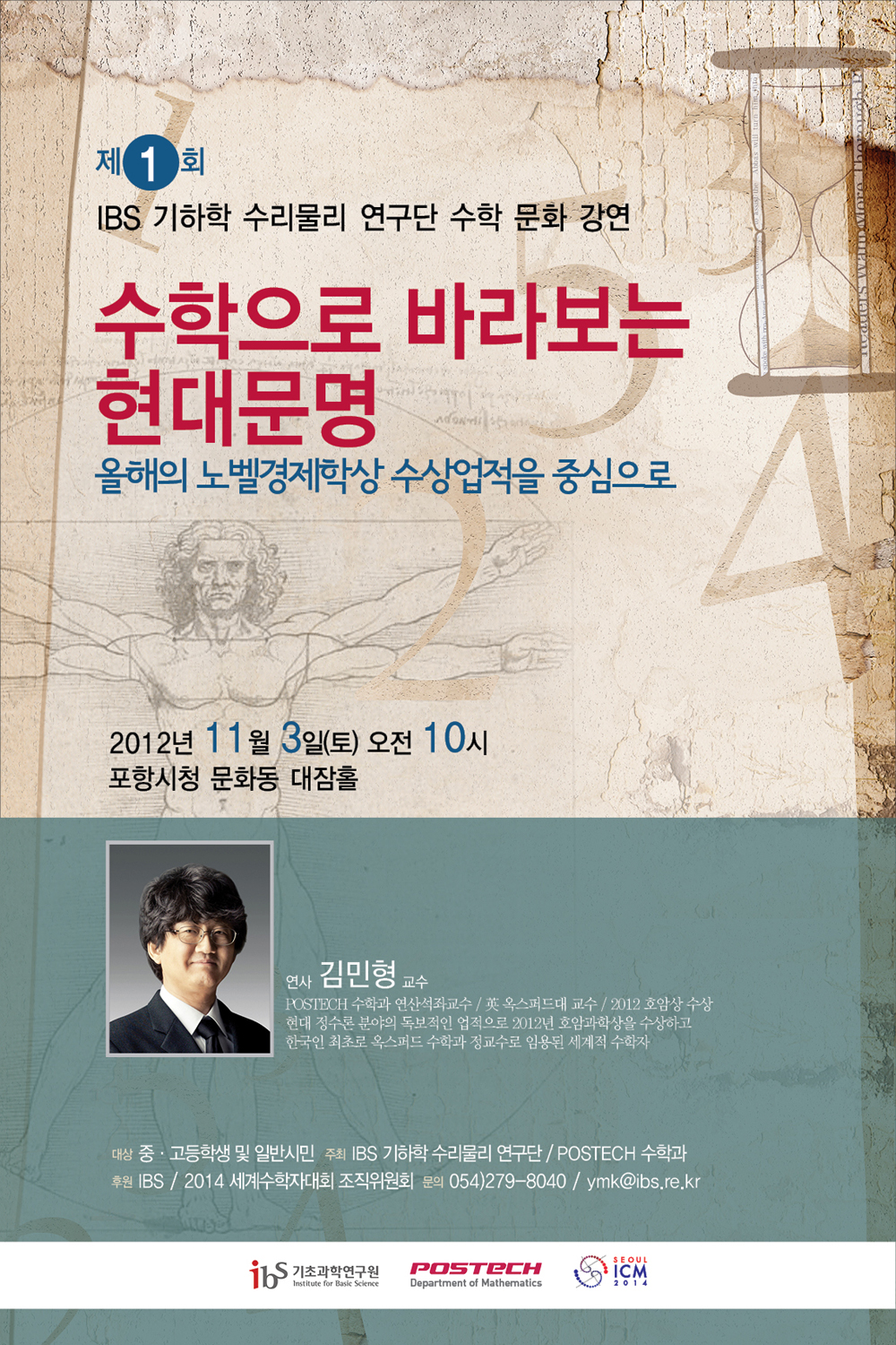 IBS 기하학 수리물리 연구단과 POSTECH 수학과가 주최하는 제 1회 IBS 기하학 수리물리 연구단 수학문화강연<수학으로 바라보는 현대문명 : 올해의 노벨경제학상 수상업적을 중심으로>가 오는 11월 3일(토) 오전 10시 경북 포항시청 문화동 대잠홀에서 개최됩니다.