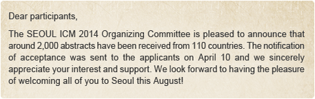 | The SEOUL ICM 2014 welcomes any organizations or companies wishing to support this event. Package sponsorship and exclusive sponsorship are available and they offer various compensation models to meet different needs and to maximize exposure during the Congress. For more information, please visit the official SEOUL ICM 2014 website. |